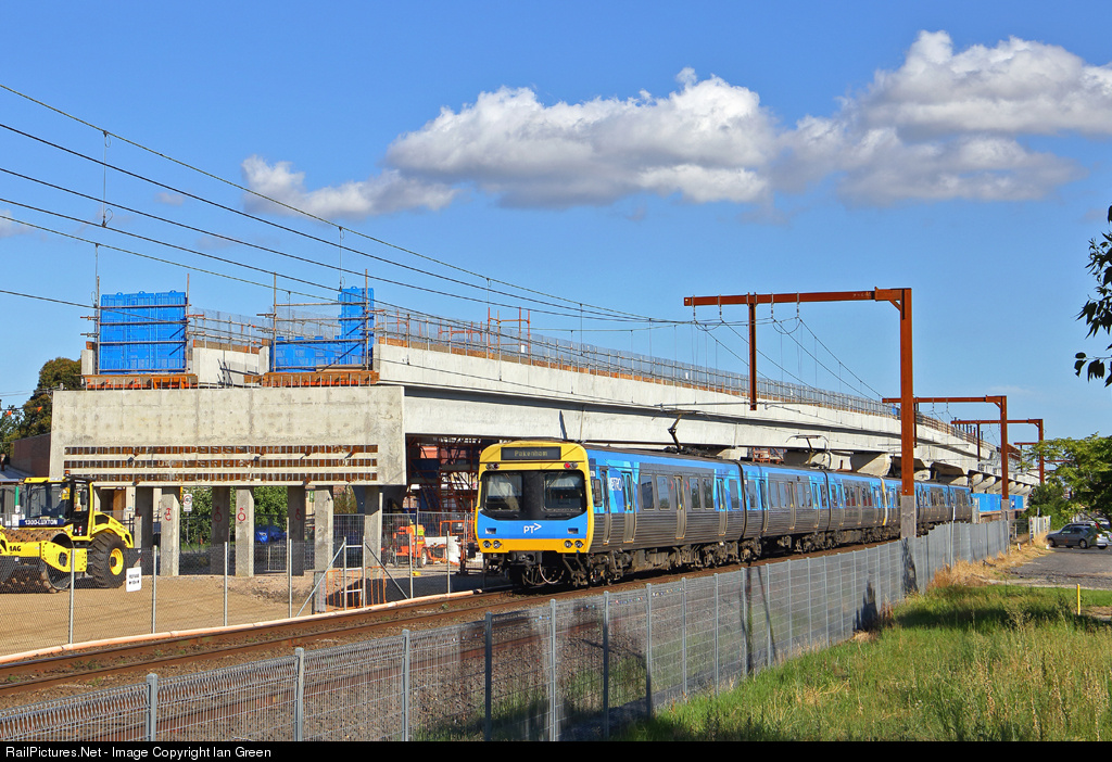 "Skyrail" works to elevate the railway along sections of the Dandenong line are well advanced as a southbound Comeng set approaches Clayton Station.