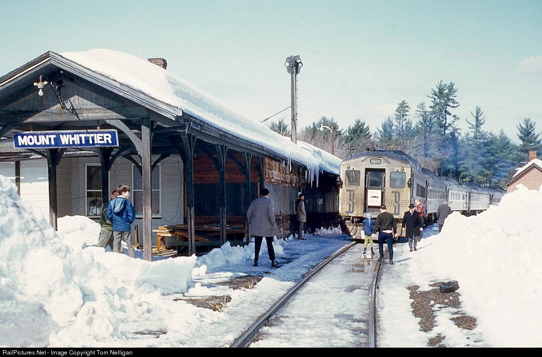 A New England rail tradition for many years was the February snow train excursion over the Boston & Maine between Boston and North Conway, NH, that was sponsored by the Boston chapter of the Railroad Enthusiasts (now Mass Bay RRE). This 1969 edition, consisting of five B&M RDCs, paused for a photo stop at Mount Whittier on the Conway branch. Four years later this middle section of the branch was abandoned, although the north end remains in 2018 as the Conway Scenic Railroad and the south end is now the New Hampshire Northcoast.