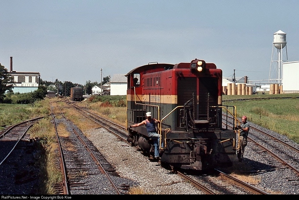 | We're on top of the Gettysburg's rough-riding converted autorack "observation car," watching our mixed freight's Baldwin pusher getting ready to do some switching. No. 407 was built in May of 1953 for the Monongahela Railway. |