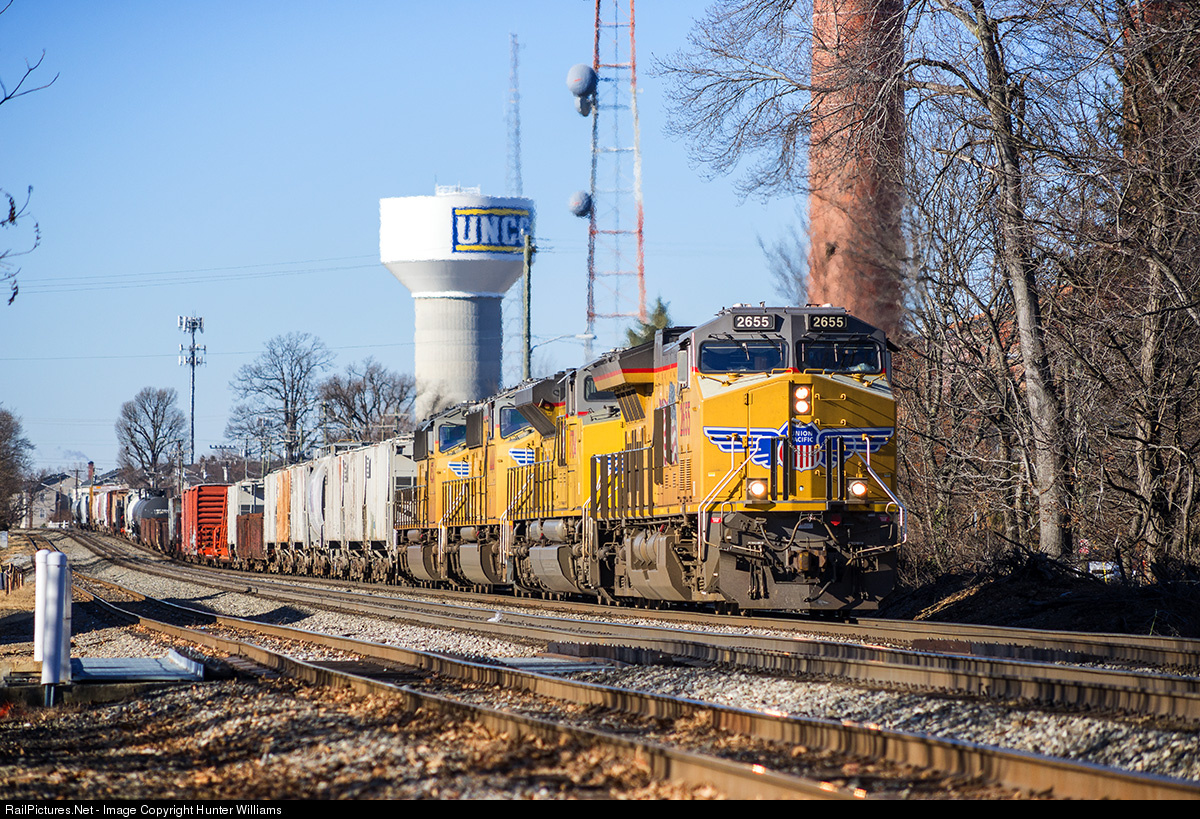 | Four Union Pacific-owned locomotives lead Norfolk Southern manifest freight train 165 through Greensboro, NC on January 2, 2018. |