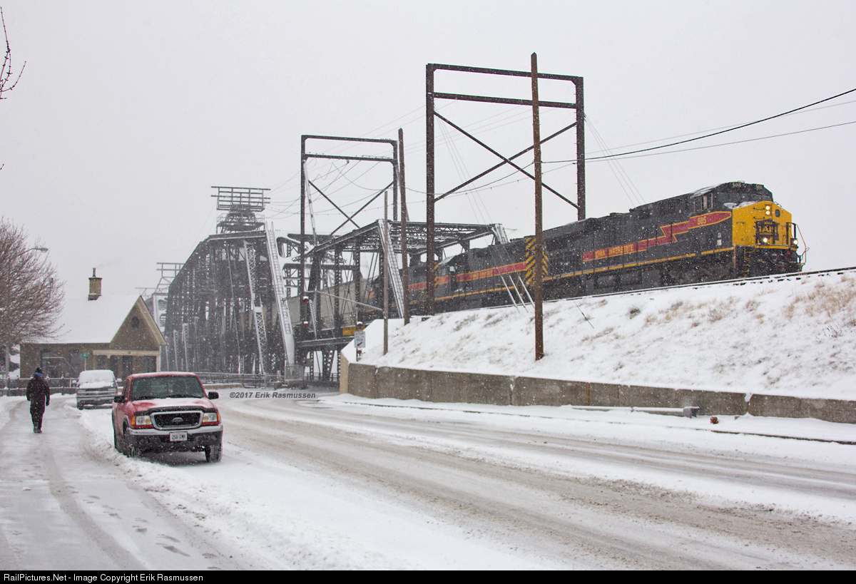 Iowa Interstate's daily eastbound crosses the Mississippi River over the Government Bridge into Illinois during a snow storm.