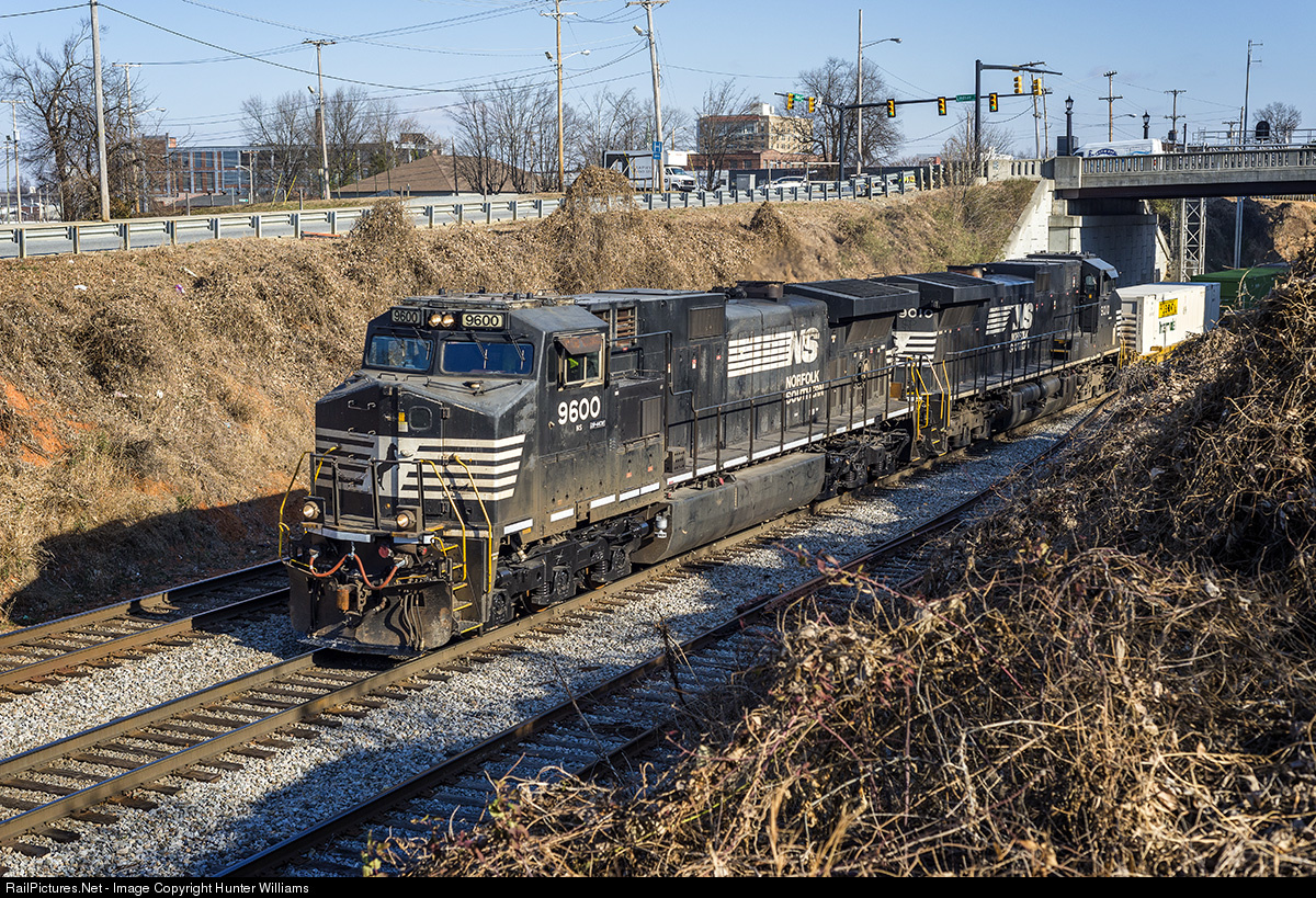| A pair of "dash 9" locomotives lead Norfolk Southern southbound intermodal train 218 through High Point, NC on January 4, 2018. |