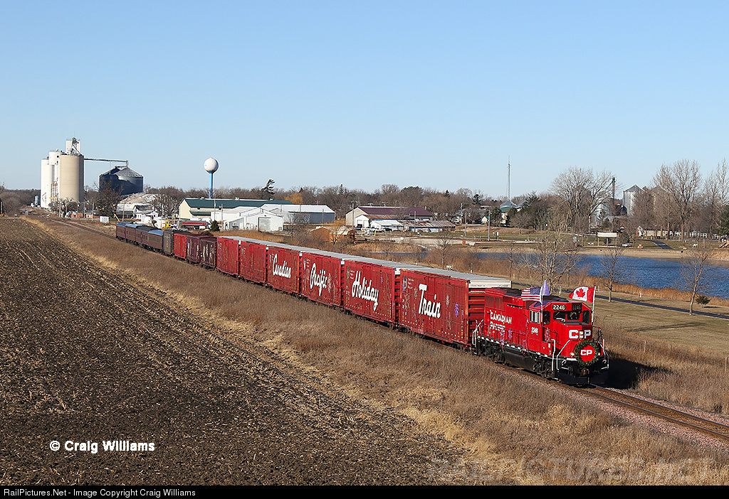 | The Canadian Pacific ran their holiday train via Mason City. The past 2 days the train ran the east end of the DM&E and now is enroute from Mason City to Marquette and points north. Here the train passes thru Rudd about 17 miles east of Mason City. The 1st stop today is a 11:30 show at Charles City. |