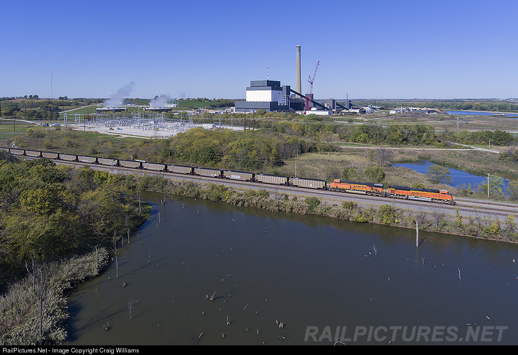 A loaded coal train treks across southern Iowa enroute to the West Olive, MI, for Consumers Power. The train is seen here passing the ISU Generating Station west of Chillicothe, IA. The train is on the Ottumwa Sub and is working between Creston, IA, and Galesburg, IL as it pass thru CP 288.