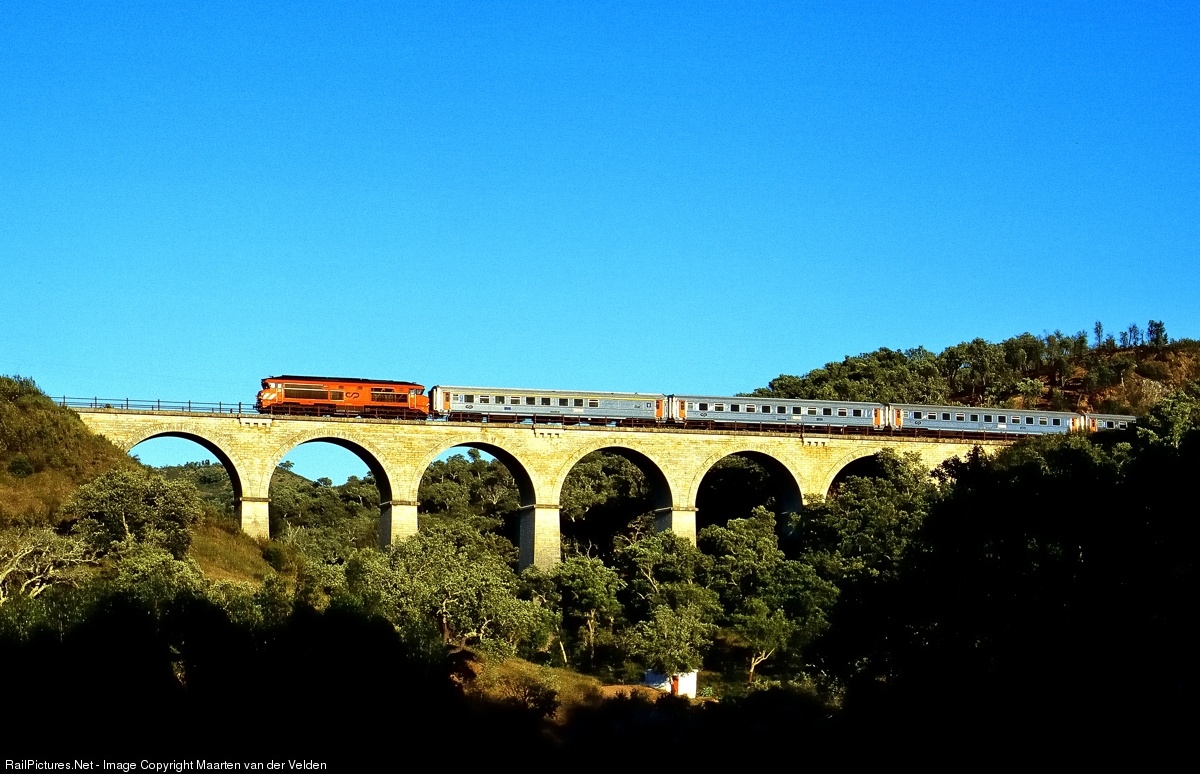 A CP 1900 class locomotive passes a viaduct near Pereiras with Rápido IC 570 from Faro to Barreiro.
