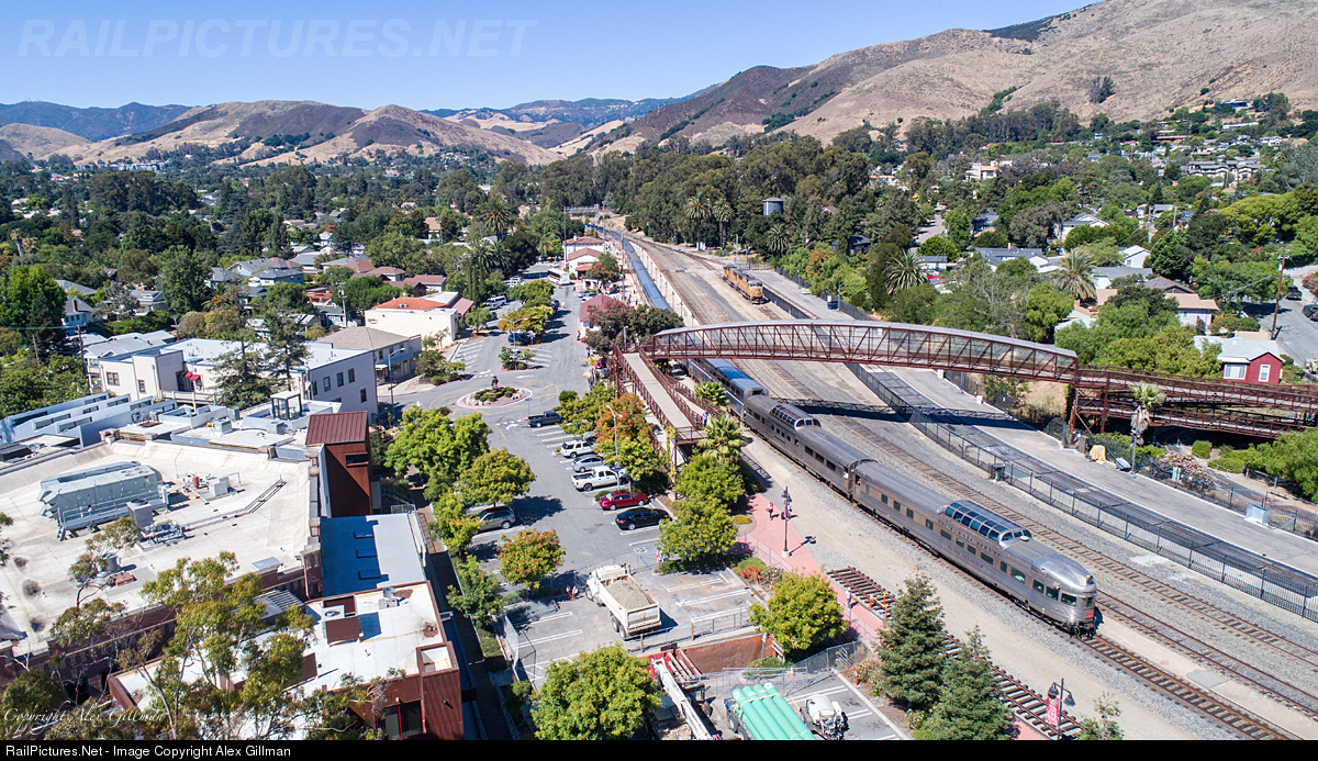 It's a warm afternoon in San Luis Obispo as lucky passengers aboard the ex-California Zephyr dome cars "Silver Lariat" and "Silver Solarium" take up a chance to stretch their legs during the Coast Starlight's scheduled station stop here on the Central Coast. Looming in the background, the hills of Cuesta Pass patiently wait to offer this afternoon's passage of the Starlight its daily dose of mountain railroading.