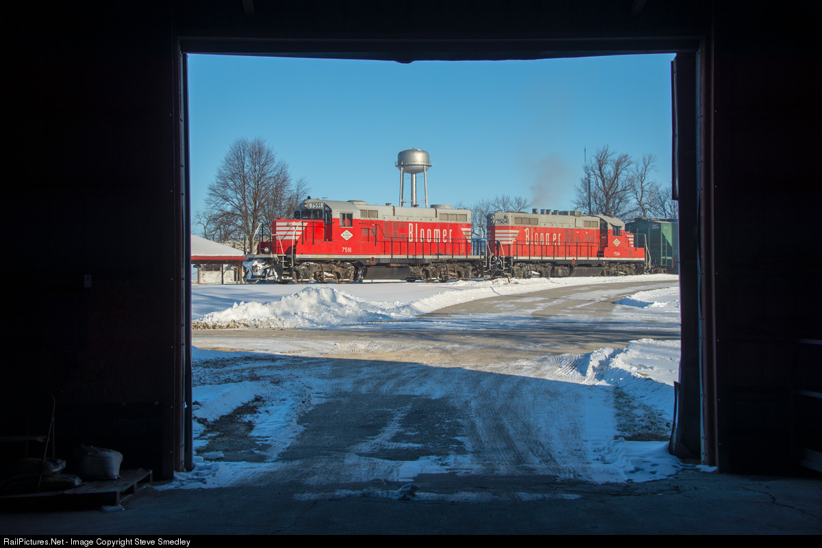 Engineer Paul Jones spots grain hoppers for loading at the Alliance Grain Company Anchor Elevator, in -7 degree weather on Friday morning. BLOL 7591 was the first unit on the roster, an ex Northern Pacific unit, while trailer 7504 was the last purchase, a Paducahbilt GP10. Steve Smedley photo