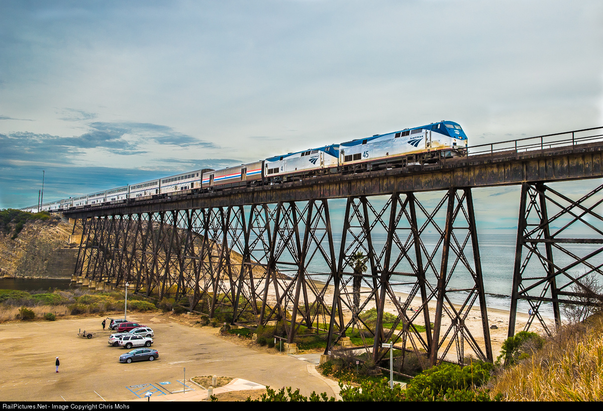 | Amtrak No.14,the westbound Coast Starlight, crosses then 811 foot span of the Gaviota Trestle over Gaviota Beach. |