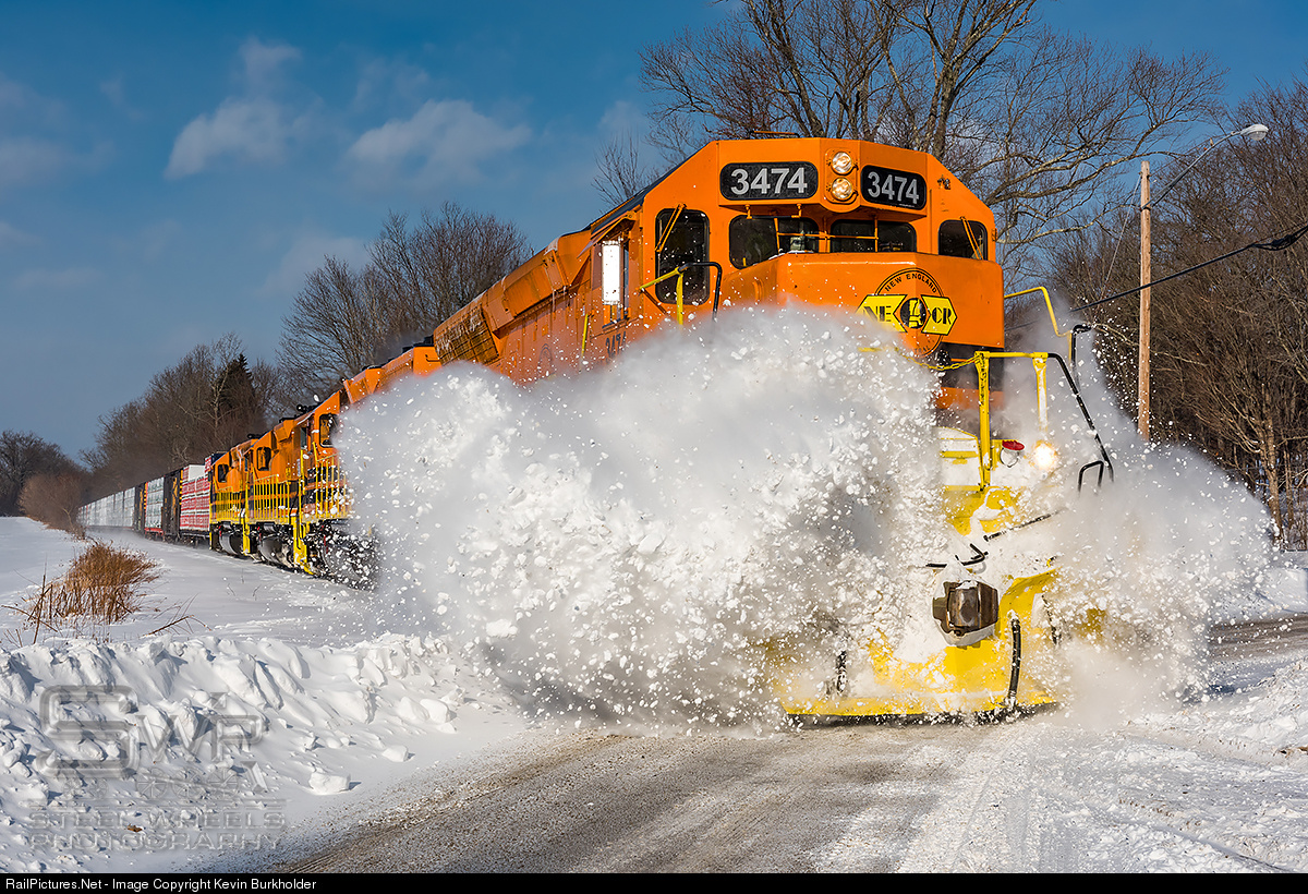 New England Central Railroad’s St. Albans, Vermont to Palmer, Massachusetts train 324/611-05 is seen “blasting” through the Upper Farm Road crossing in Northfield, MA, on Friday, January 5. The train is led by NECR SD40M-2 quartet, NECR 3474, 3405, 3478, and 3475.