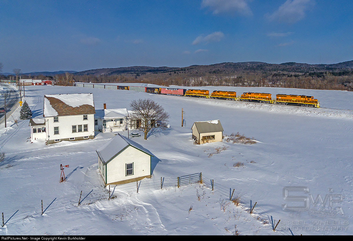 New England Central Railroad’s St. Albans, Vermont to Palmer, Massachusetts train 324/611-05 is seen southbound through rural Vernon, Vermont, on Friday, January 5. The train is led by NECR SD40M-2 quartet, NECR 3474, 3405, 3478, and 3475.