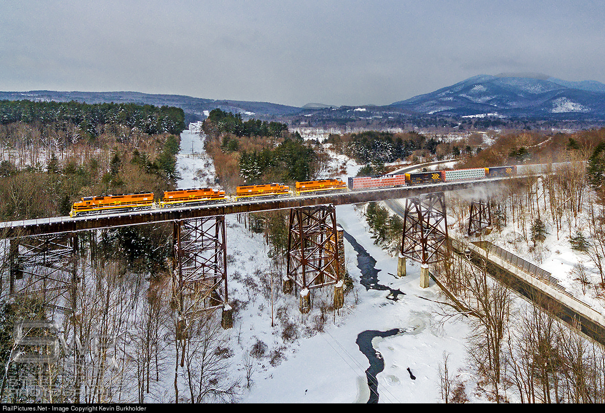 New England Central Railroad’s St. Albans, Vermont to Palmer, Massachusetts train 324/611-05 is seen crossing the Sugar River Trestle in Claremont, NH, with Vernont’s Mt. Ascutney looming under snow clouds in the distance, on Friday, January 5. The train is led by NECR SD40M-2 quartet, NECR 3474, 3405, 3478, and 3475.