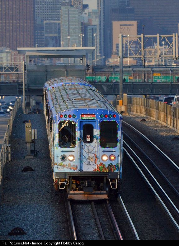 The 2017 CTA Holiday Train makes it way down the Dan Ryan in the last minutes of sun.