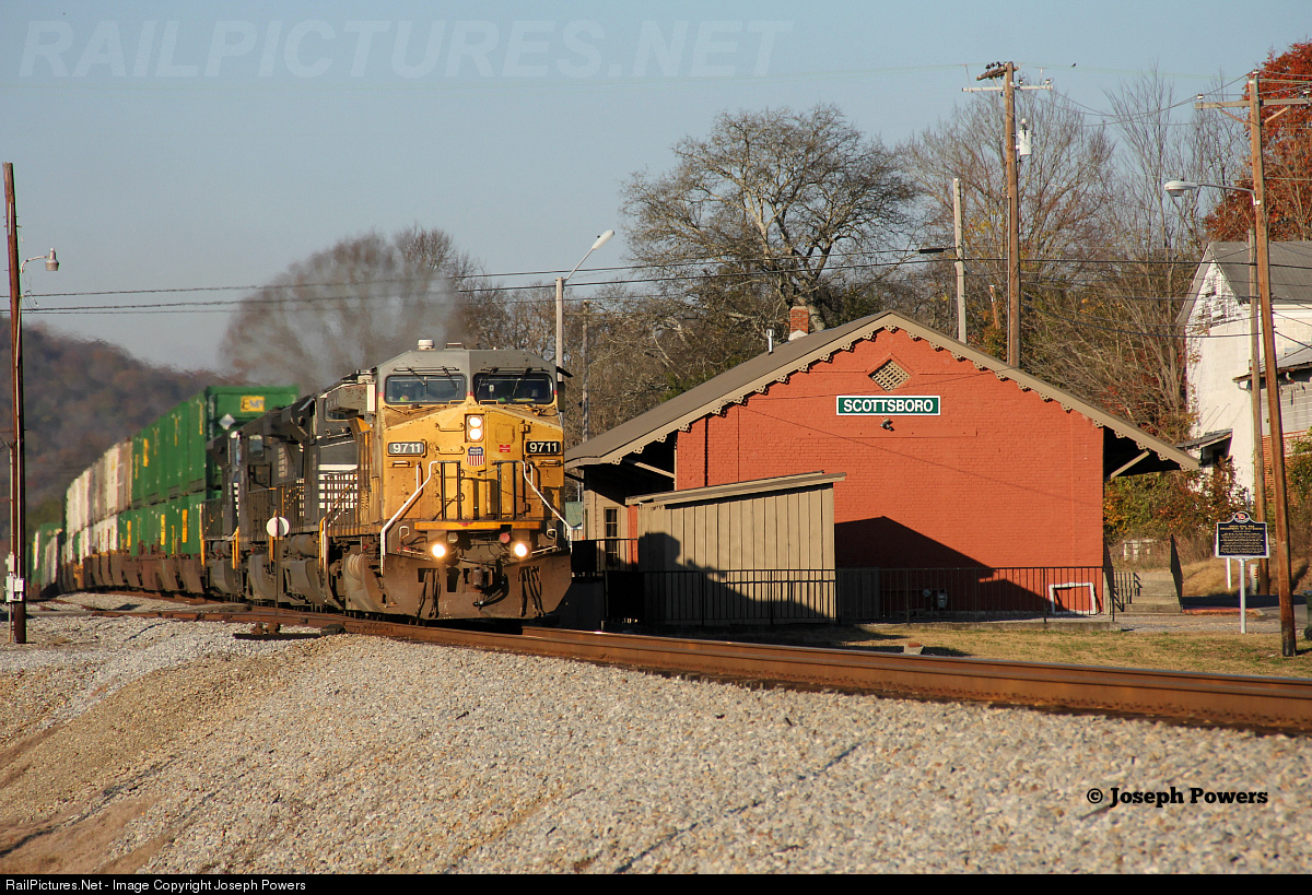 Norfolk Southern intermodal train 202 (Rossville, TN to Rutherford, PA) is passing the depot in Scottsboro, AL. The depot was built by the Memphis and Charleston Railroad just prior to the outbreak of the American Civil War. The building is now a local museum.
