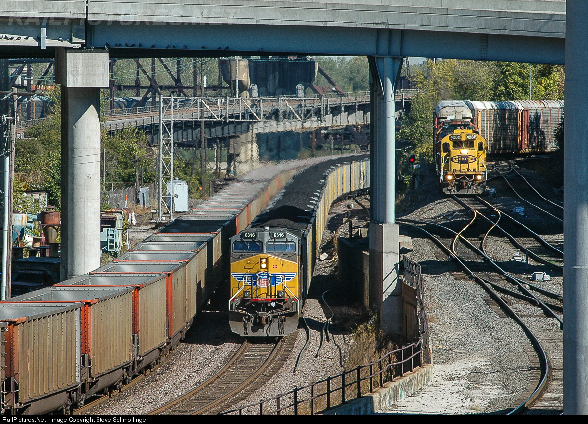 | UP coal trains meet in Kansas City's West Bottoms as a southbound BNSF transfer comes down the Gooseneck with autoracks. The UP coal empties at left will proceed past Armourdale Yard on the other side of the Missouri River as the eastbound proceeds to a power plant with DPU 6316 shoving on the rear. The BNSF train is headed for Argentine Yard. |
