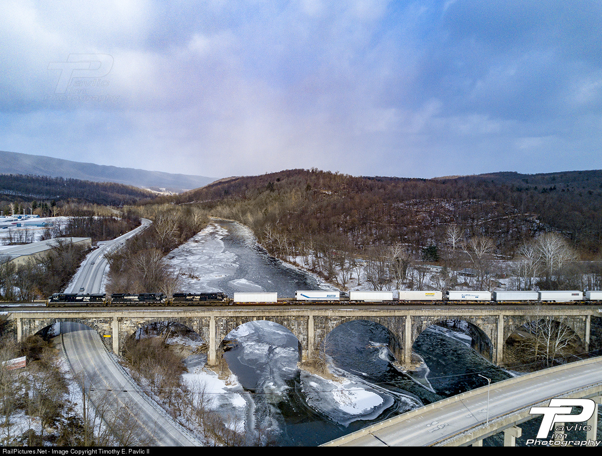 A westbound intermodal train crosses the Juniata River at Mount Union on the former PRR stone viaduct. The weather has been in single digit temperatures for the past week, leaving the Juniata River the most frozen I can remember in recent years. |