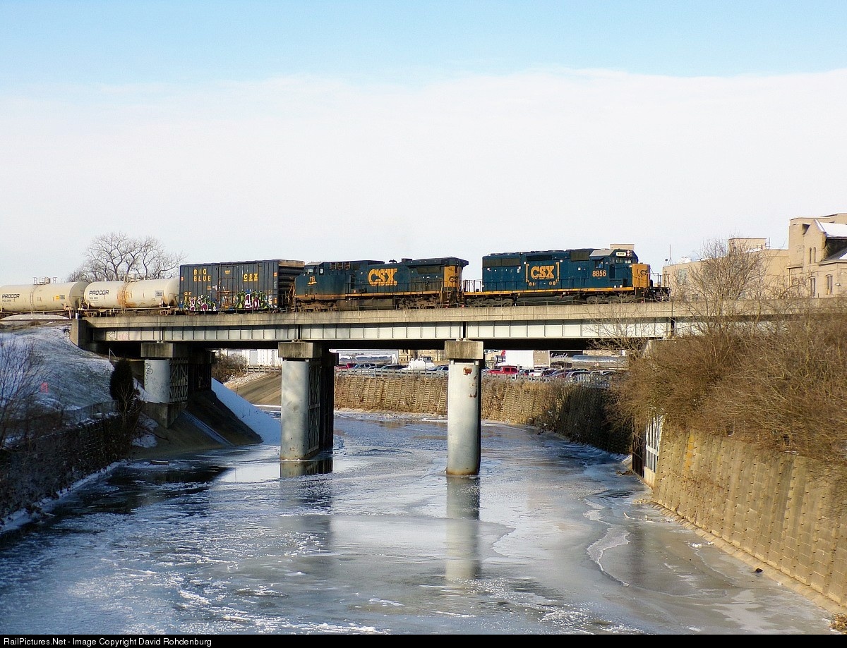 Freshly repainted in the newest CSX paint scheme, veteran SD40-2 8856 leads CSX train Q506-03 north across the frozen Mill Creek at Winton Place Interlocking in the Cincinnati suburb of Spring Grove Village on a cold January morning.