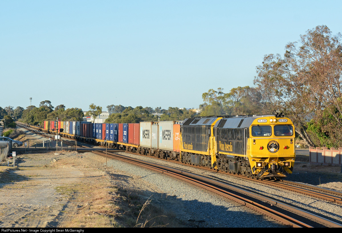 | Watco Australia's ILS container service is worked by FL220 & G511 on a crisp summer's morning in Perth. Here, 7141 roars through Bibra Lake with the morning North Quay, Fremantle to Forrestfield service. |