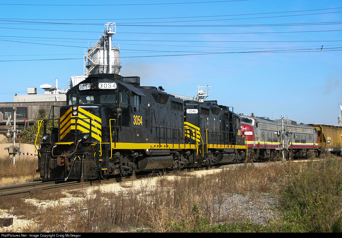When Pioneer Railcorp first acquired the Algoma Central FP9's, they stored them in an industrial park in north Peoria. In this photo, an outbound KJRY train from the Tazewell & Peoria yard has the 1752 and 1750 in tow, still in Algoma paint, heading to La Harpe to be readied for service.