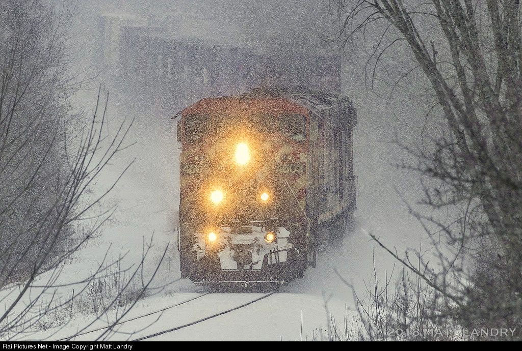 BCOL 4603 rounds the S-Curve, which is barely visible with the falling snow, as they approach Nauwigewauk, New Brunswick.