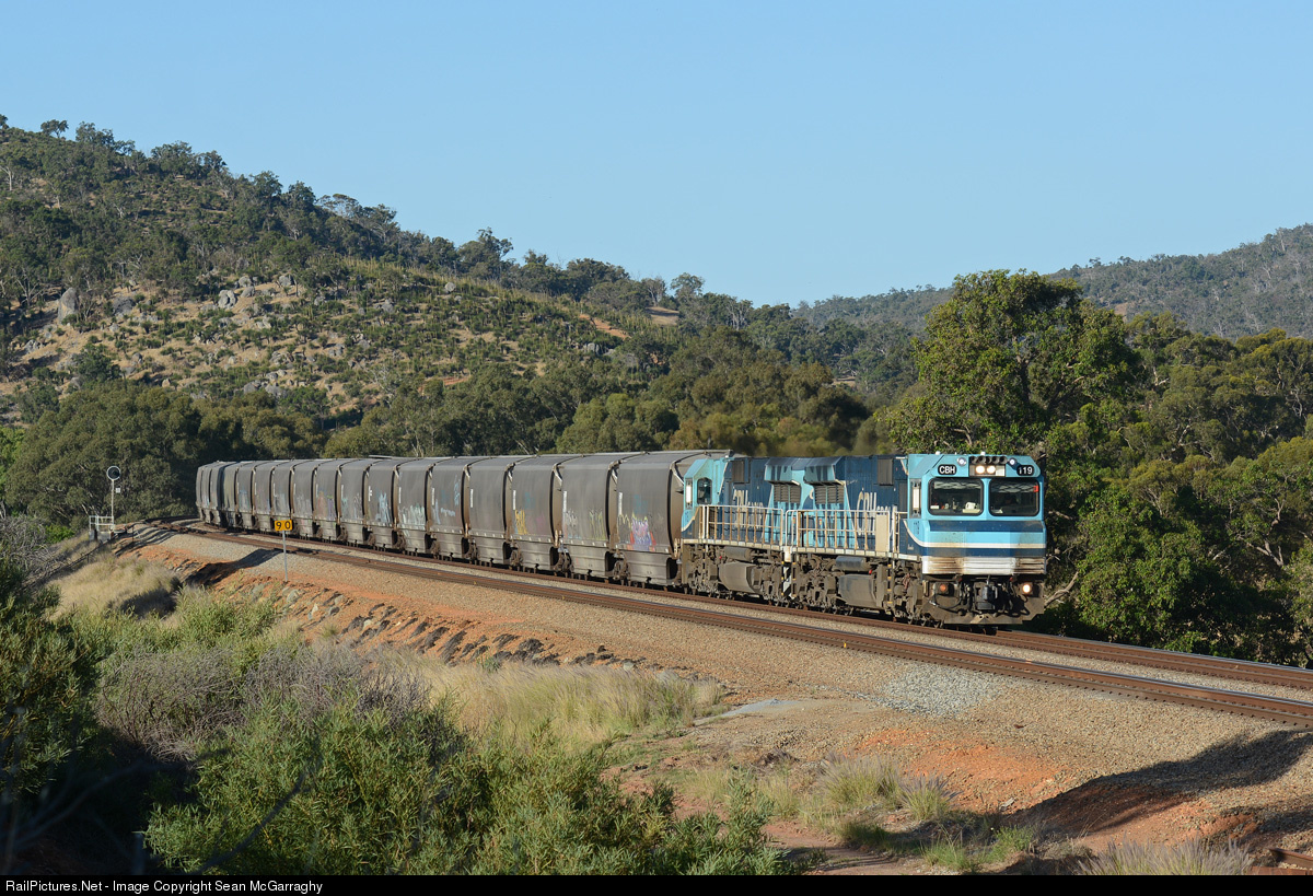 | CBH standards gauge loaded grain train 6S58 races through Brigadoon with CBH119 & CBH118 up front. This train earlier loaded at Kellerberrin and picked up pre-loaded hoppers from Tammin en route to Kwinana. |