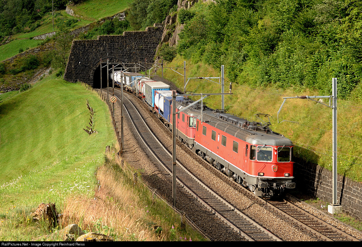 | Re 6/6 11676 "Zurzach" and an unkown Re 4/4 II head a northbound intermodal on the Gotthard northramp near Wassen. |