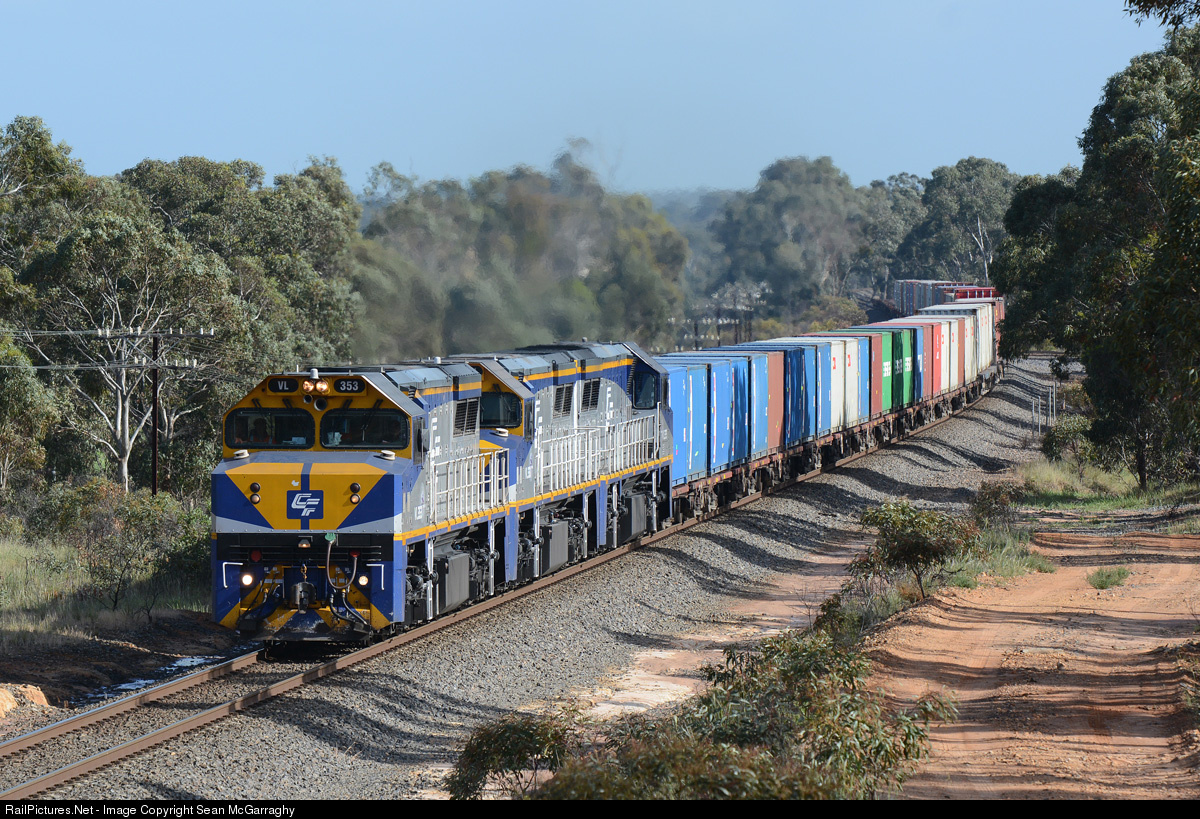 | Recently leased locomotives from Chicago Freight Car Leasing Australia, VL353, VL361 & VL359 pass through Deep Lead as they work SCT's 7922V containerised grain service from Dooen to Melbourne. The VL's are on hire to cover a major locomotive shortage at SCT following the commencement of their Melbourne-Brisbane intermodal traffic. |