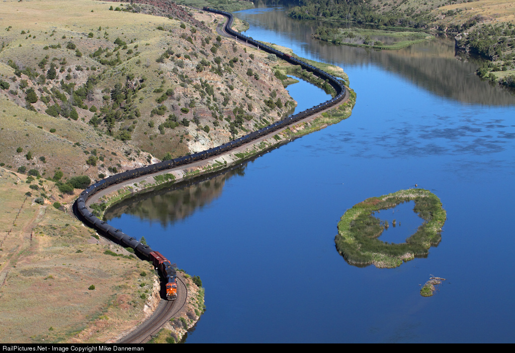 A BNSF oil train is negotiating six curves at once along the Missouri River as it works its way west through Lombard Canyon leaving Lombard, Montana, on a clear June 25, 2017.