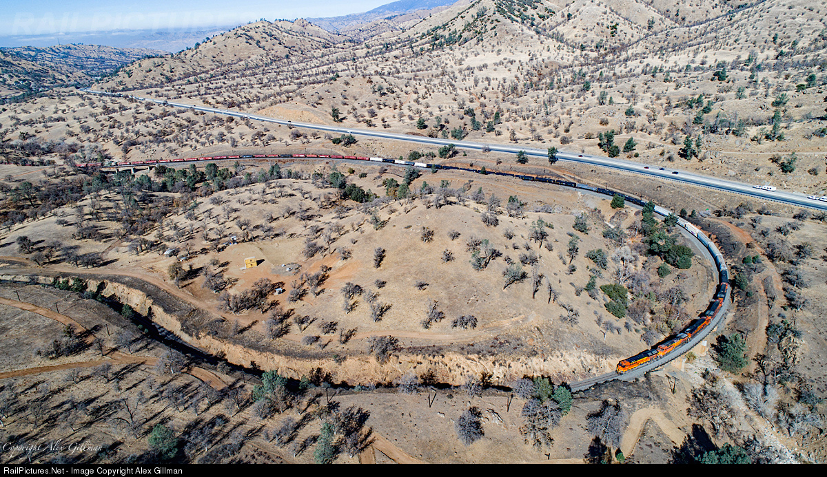 | Snaking its way out of Woodford toward the Tehachapi Loop, BNSF 3741 leads the eastbound RICBAR over the two crossings of the Tehachapi Creek here and it negotiates the horseshoe curve here. |