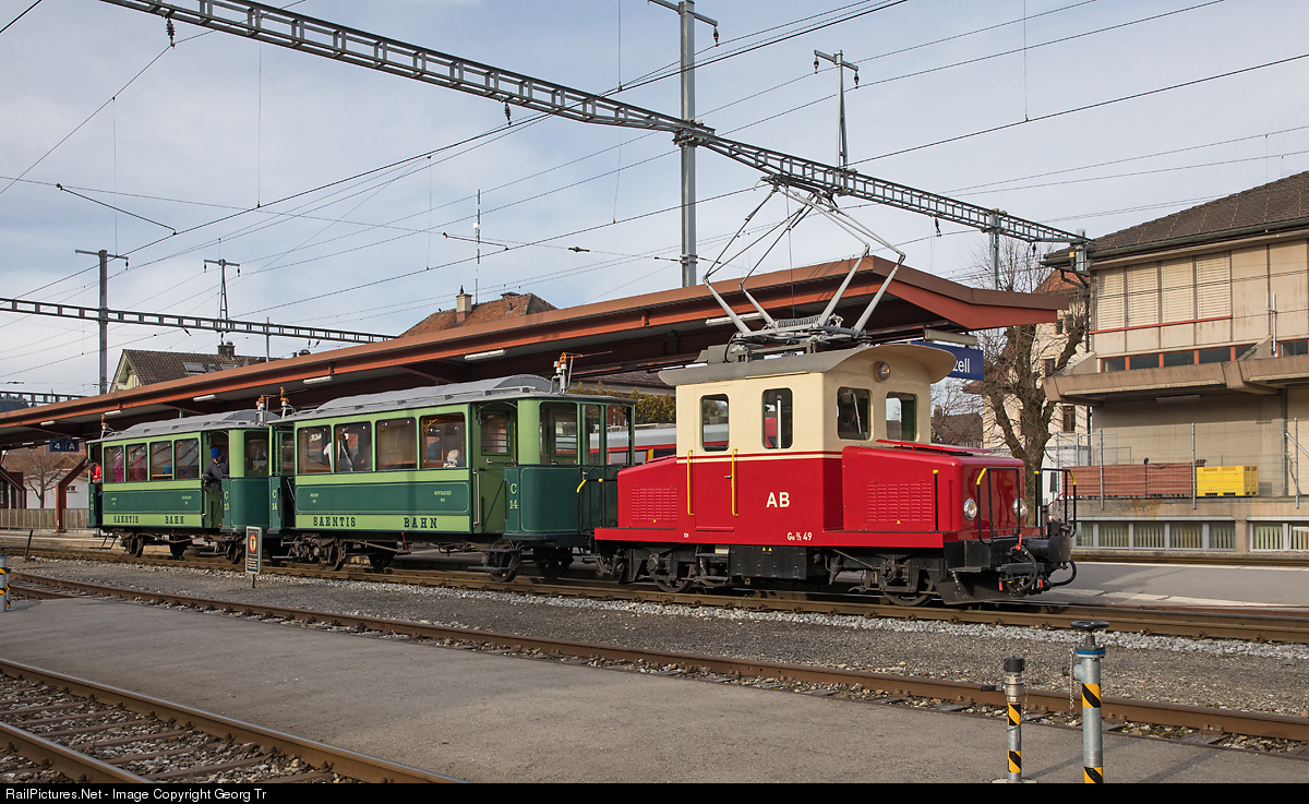 A charter train of the Appenzeller Bahnen (AB) for the Railway Touring Company from the UK is leaving Appenzell bound for Wasserauen. Pulling is a tiny electric narrow gauge locomotive Ge 2/2 # 49 with an interestic history. Built in 1912 by SWS and MFO as electric railcar CFe 2/2 # 3 for the Säntis Bahn, which was later the Appenzell-Weissbad-Wasserauen Bahn (AWW). In 1955 new built with part of the frame of the railcar, the traction motors and electric equipment, but new body as electric locomotive Ge 2/2 # 49 (from 1975 to 2012 designated as shunter Te 2/2 # 49). The cars C # 13 and # 14 are original from the Säntis Bahn, in the contemporary colors.