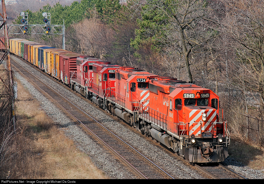 | Mmmmmm.... can you say whole EMD goodness? Back when CP had hundreds of SD40-2's in service, you would always expect every other train with a one in the consist or a pair or a trio. Here what looks to be 222 from Winnipeg is on the home stretch to Agincourt Yard with some 16-645E3 symphony. |