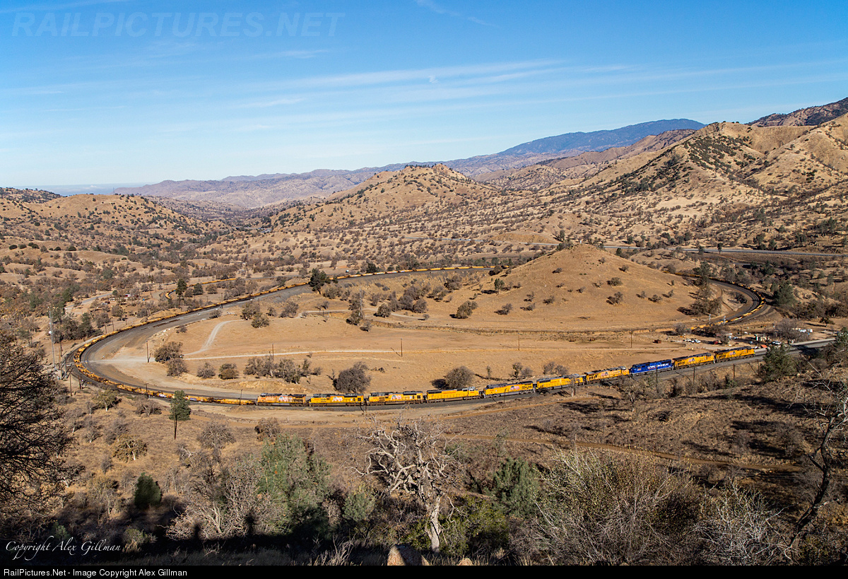 Working against the morning light off the Tehachapi Loop, UP 8220 and nine other units, including UP 2001, leads a Long Beach-bound baretable train south.