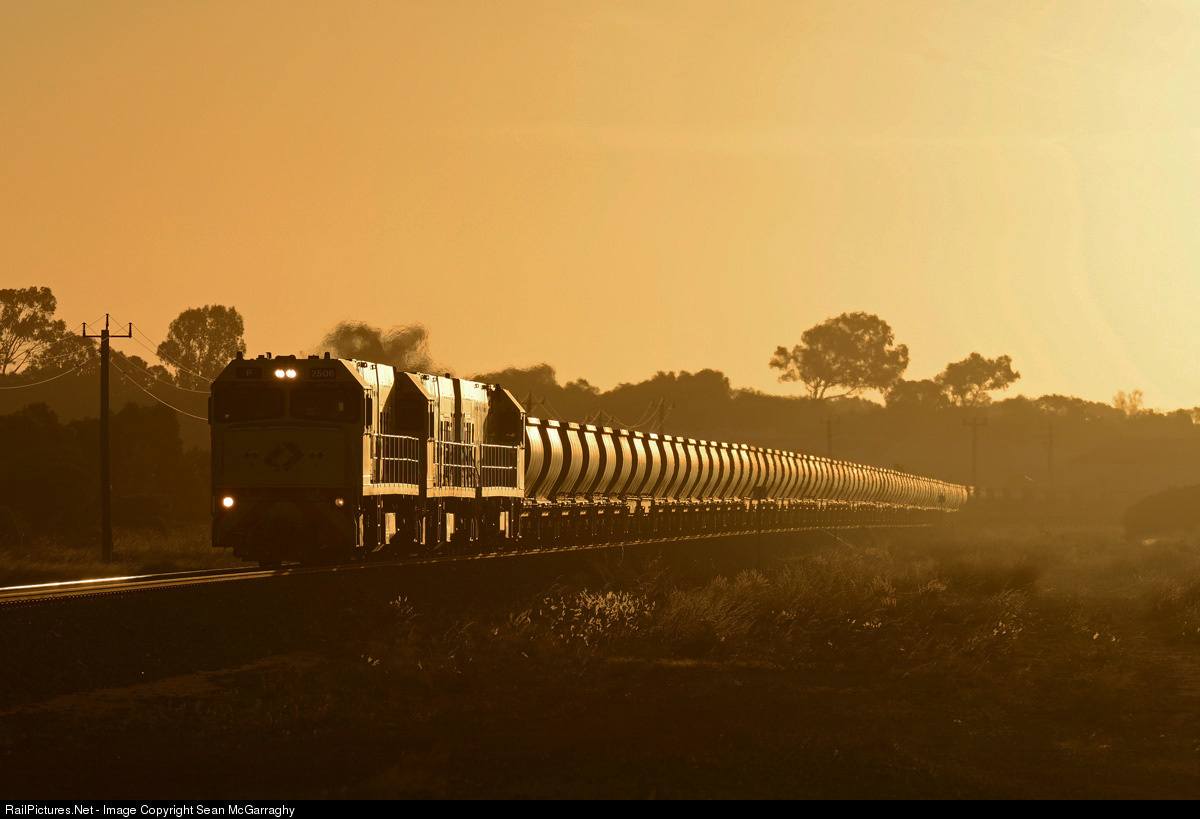 | In impressive late afternoon sun, the triple headed Mt Gibson empty iron ore set 5722 with P2506, P2505 & P2513 pull out of Narngulu yard to stable at the new Narngulu East yard for a few hours before its night departure to Perenjori where it will load. |