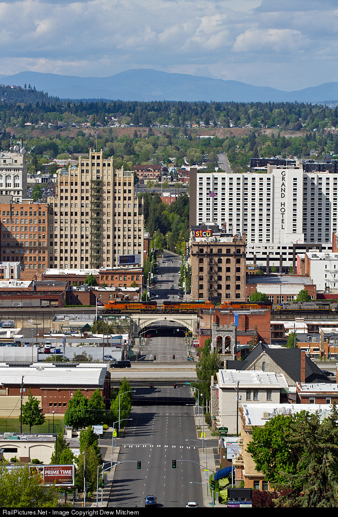 BNSF 6351 leads 3 other GE's on a westbound mixed freight from Minot, ND to Pasco, WA through Spokane, WA on the elevated main track through downtown on 4/24/16.