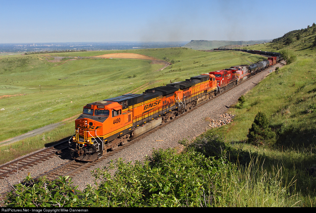 A westbound BNSF manifest freight climbs the 2% grade through Eisele (formerly Clay), Colorado, on the afternoon of June 9, 2014. Leading the train is repainted GE C44-9W No. 4490, followed by AC4400CW No. 5839, leased Canadian Pacific AC4400CW No. 9538 and former Santa Fe warbonnet C40-8W No. 874 in whipped “pinkbonnet” dress. In the background to the left is Big 10 Curve and the city of Denver.