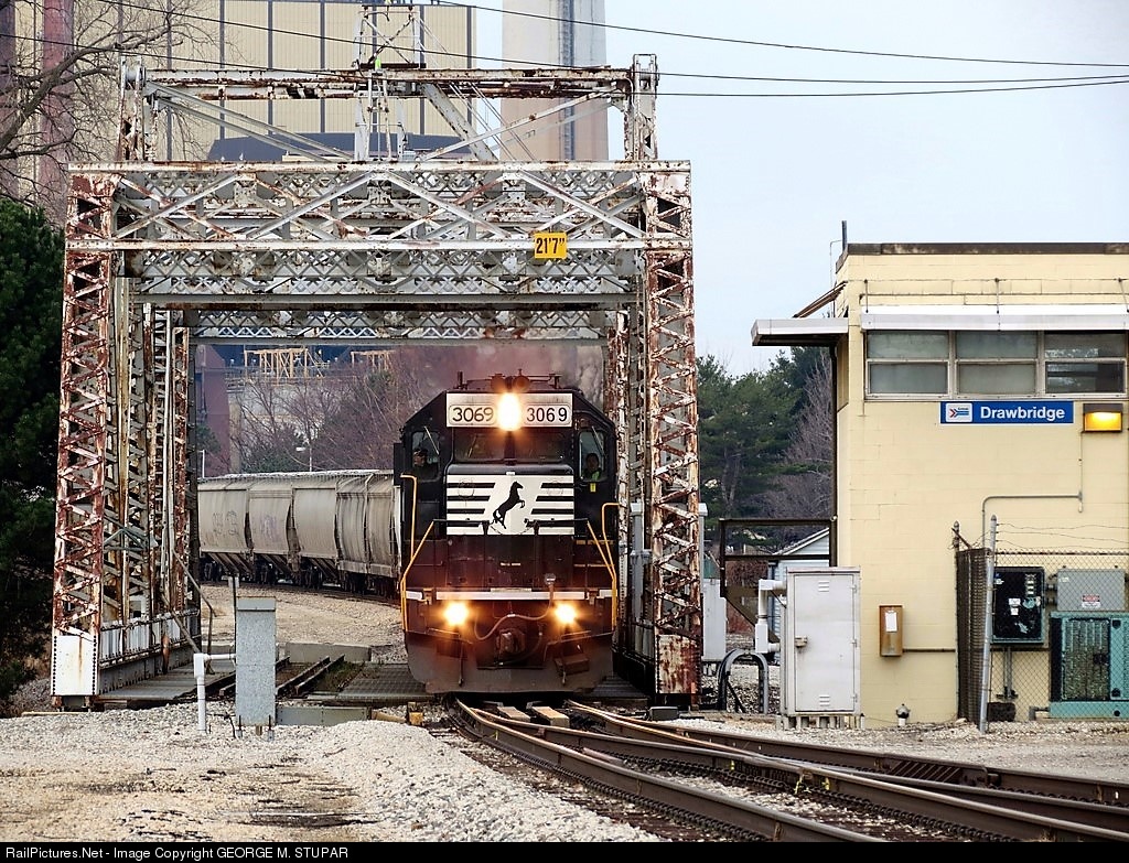 NS 3069 leads a rather long covered hopper train eastward across Trail Creek at the drawbridge on the Amtrak Michigan Line. Photo by Jeff Stupar.