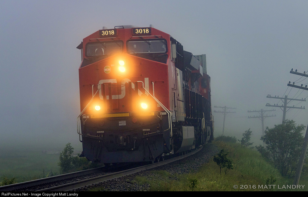 Through some thick fog, CN 3018 leads eastbound stack train Q120 as they round the non-viewable S-Curve at Upper Dorchester, New Brunswick.