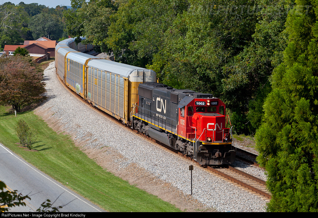 | While I wish it was still in Illinois Central Paint, IC 1002 was still a welcome visitor with 57 loaded racks on the drawbar. |