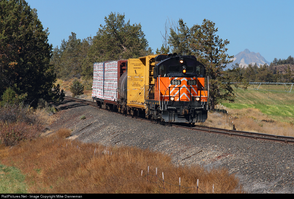 On September 28, 2016, a City Of Prineville Railway freight approaches Lone Pine Road at ONeil, Oregon, with the top of Mount Jefferson looming above the trees in the background. The Milwaukee Road-looking locomotive is no accident—COPR No. 989 is one of the Milwaukee’s unique GP9 rebuilds labeled a GP20 of the same road number, repainted by the railroad in a very similar scheme.