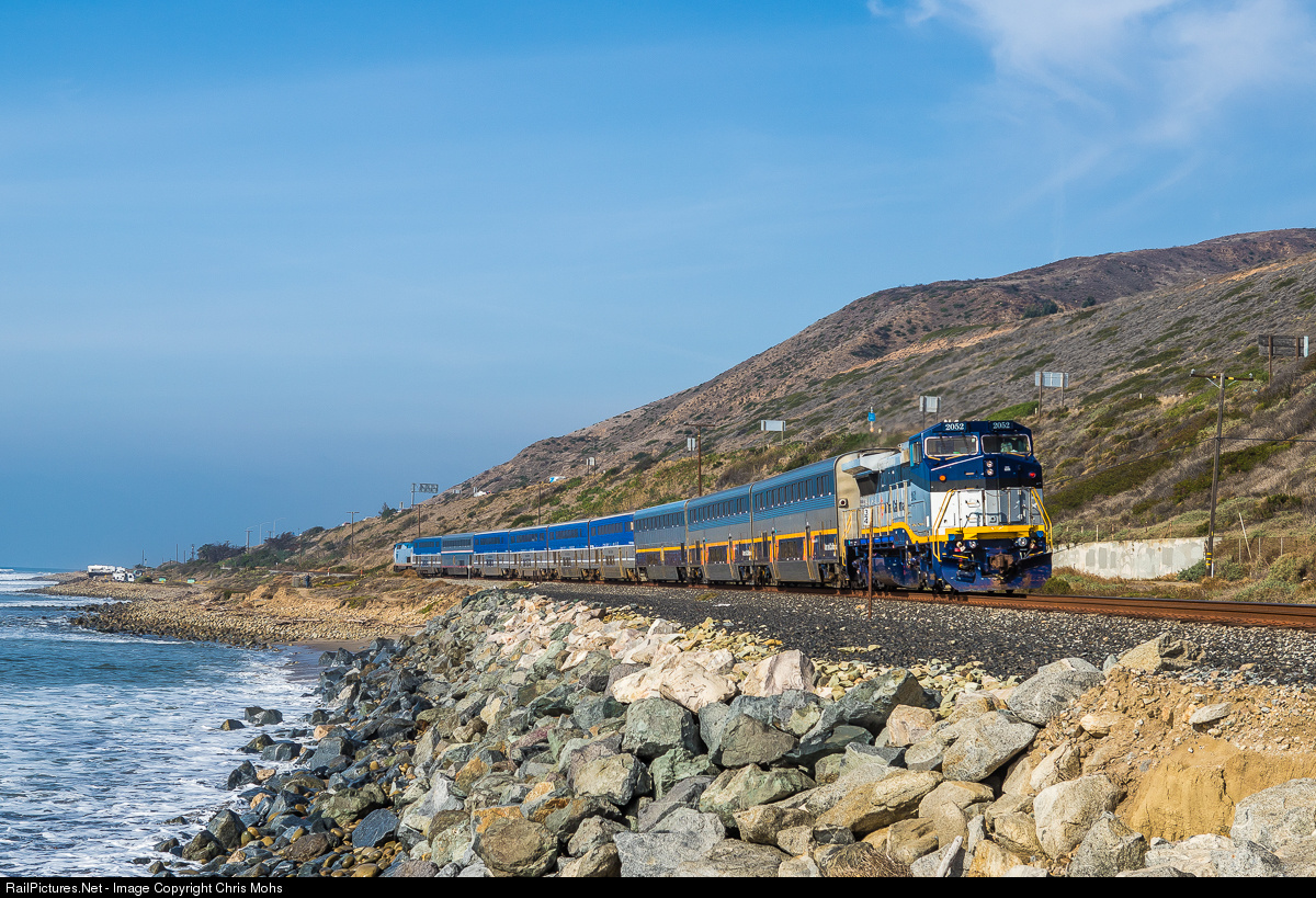 | Amtrak San Joaquin CDTX 2052 and Cars from the San Joaquin Valley join Surfliner No. 763. Extra engines and cars are helping with the demand on all Surfliners because of hundreds of people trying to make their way to Santa Barbara through the devastating mud slides in the Montecito area. The other way of getting there is by charter boats that are running as ferries. |