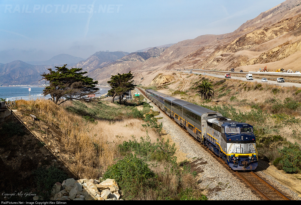 | A Fish Out of Water. Miles away from its home rails on San Joaquin service, CDTX 2052 and a trio of Amtrak California coaches find themselves on the rear of Amtrak 763 this morning as it coasts through Emma Wood State Beach on its journey north. Brought down to Los Angeles from Oakland two days ago, CDTX 2052, sister 2051 and 8 coaches have immediately been placed into action to help relieve already overcrowded trains during the closure of US 101 in Montecito. |