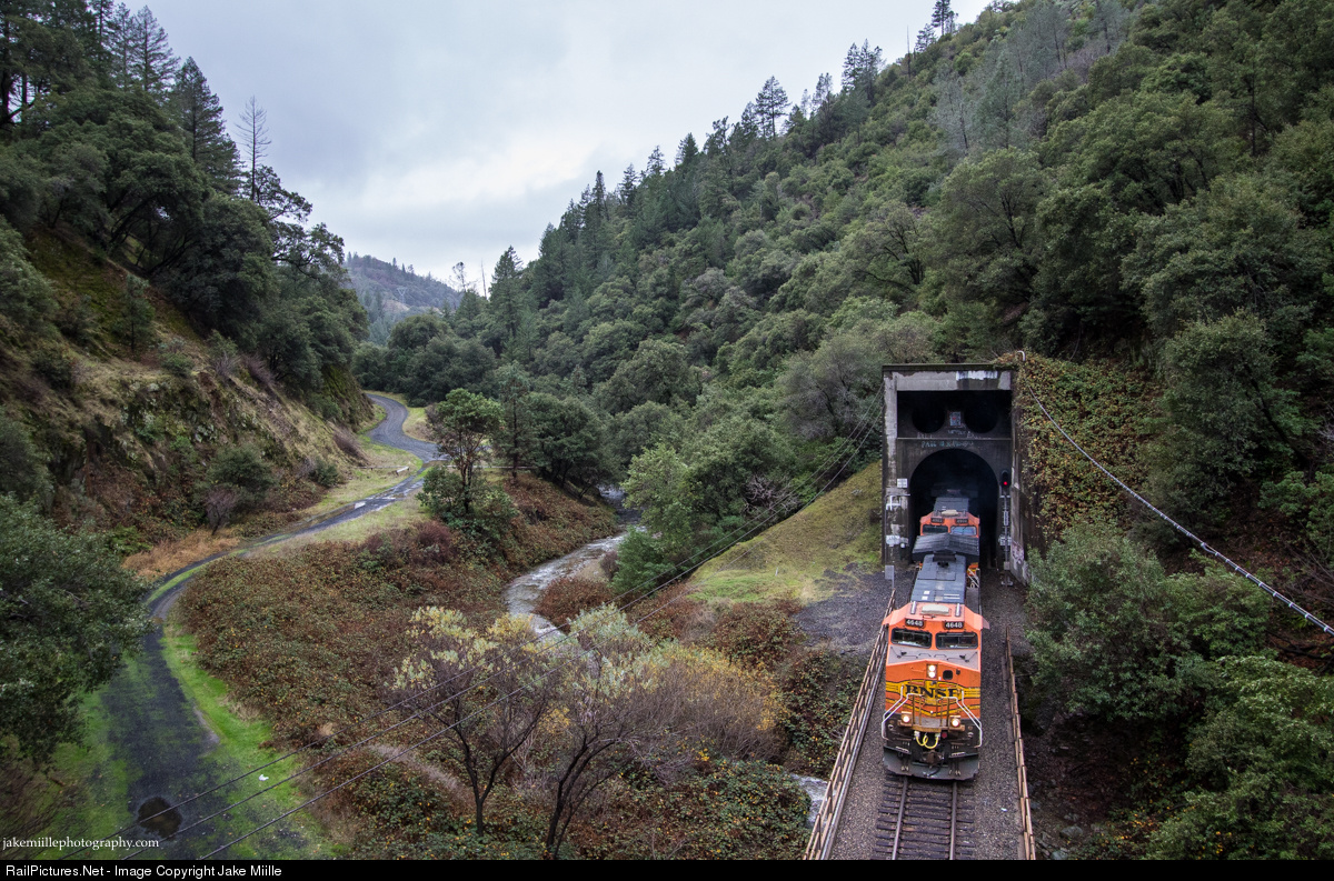 | BNSF 4648 exits Tunnel 7 and prepares to immediately enter Tunnel 8 at Dark Canyon as it heads eastbound along the Feather River Route. With a storm order in affect, the conductor was coordinating with Bronco Alpha at Intake for an eastbound escort. A couple inches of rain led to swollen creeks and tributaries throughout the area, creating a potentially dangerous journey through the canyon. |