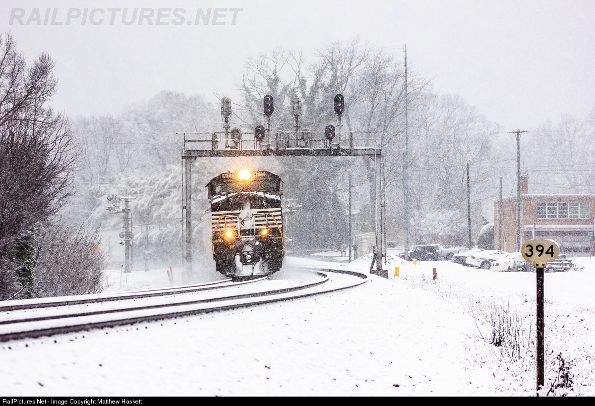 NS 118 comes though the snow in Lowell, NC with the classic southern MP sign and signals. Snow's like this are sort of a rarity in this part of NC.