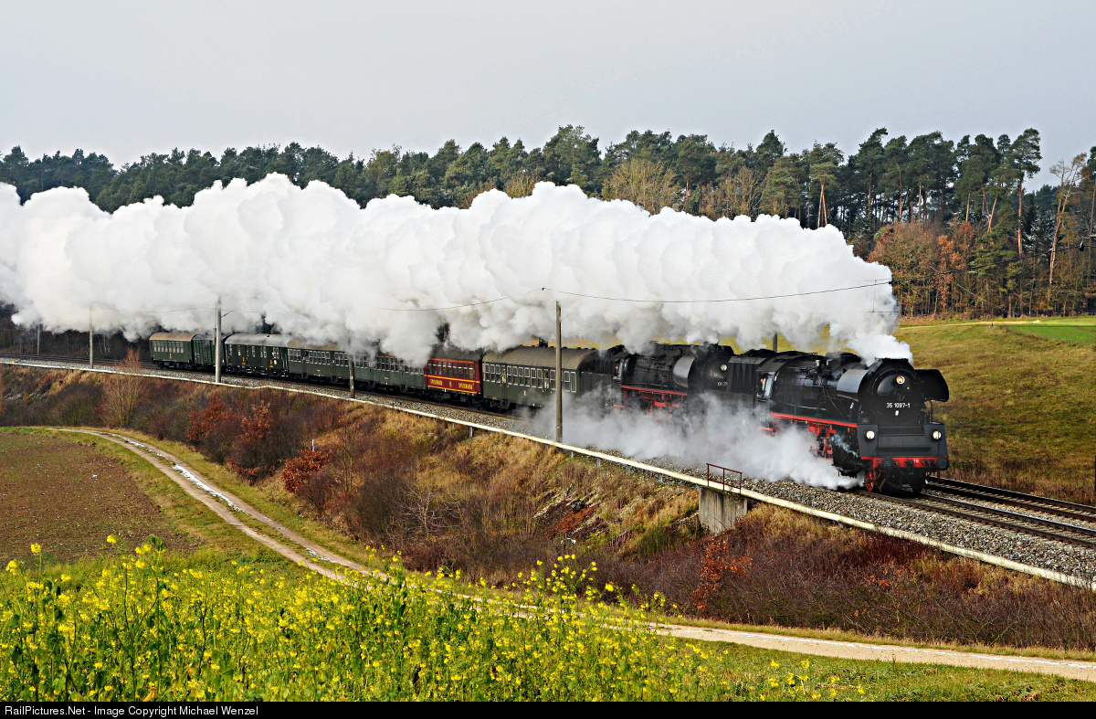 | Steam Train of association Eisenbahnfreunde Zollernbahn from Tuttlingen to Regensburg. 35 1097-1 was in the south west and southern Germany for this summer and autumn. With this trip the locomotive returned to association IG 58 3047 in Glauchau. The journey leads to Regensburg, and the same day a steam Train from Chemnitz was on the way to Regensburg. 35 1097 turned over to this train for the journey home. The second locomotive in the photo, 01 519 of EFZ leaded this Train back to Tuttlingen. |