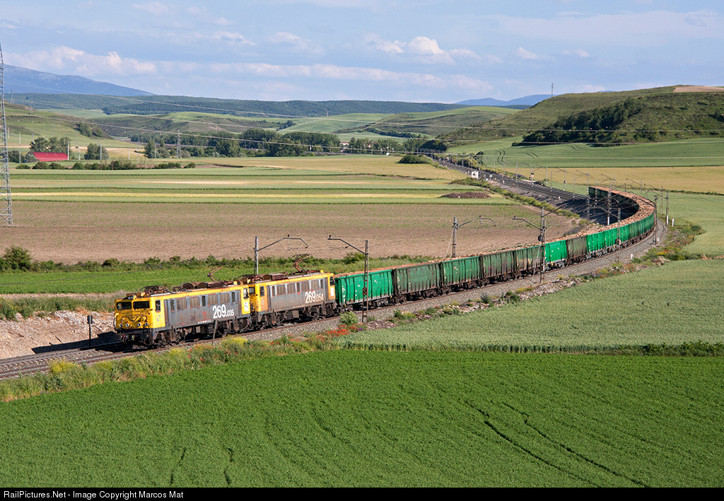 | Freight with wood logs from Galicia and with destination in Aragon in charge of two venerable Mitsubishi 269, a series of locomotives that these days lives its last moments in the Spanish railway. |