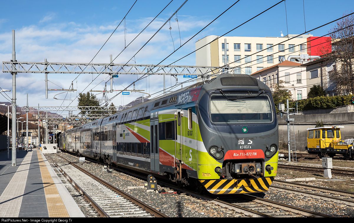 | The Treno Servizio Regionale (TSR) are a series of double-decker EMUs used by the Lombard railway company Trenord for the commuter services around Milan, and particularly for the suburban lines. With leading railcar ALe 711 # 072 a 6 car TSR is leaving Varese as S 5 service to Treviglio via Milano Porta Garibaldi. This train wears the older "LeNord" paint scheme. |