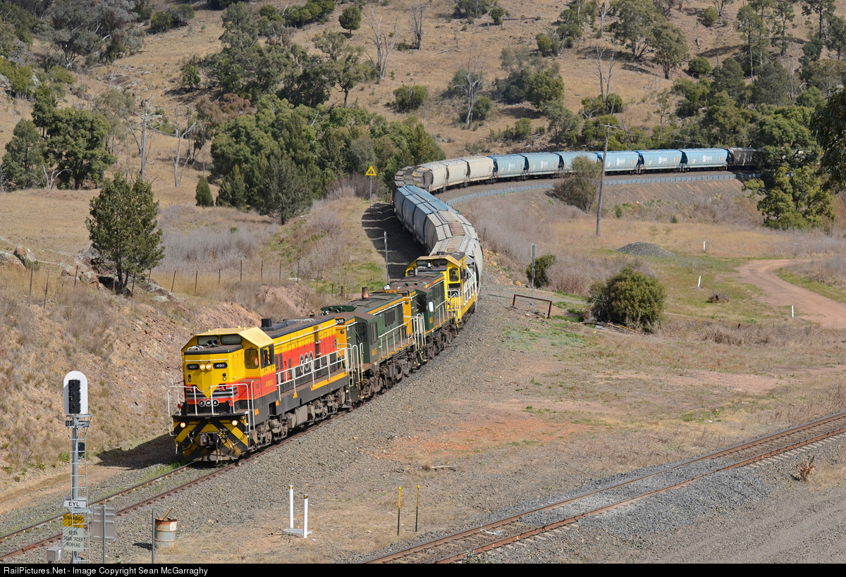 | In what was truly "struggle town", the impressive combination of 4911, 48s35, 48s28 & 4910 crawl with 8547N loaded grain from Parkes sub to Moree through The Gap near Werris Creek. With only two of the four locos working as a result of failures, this train was estimated to be doing around about 2-5 kilometres per hour. |