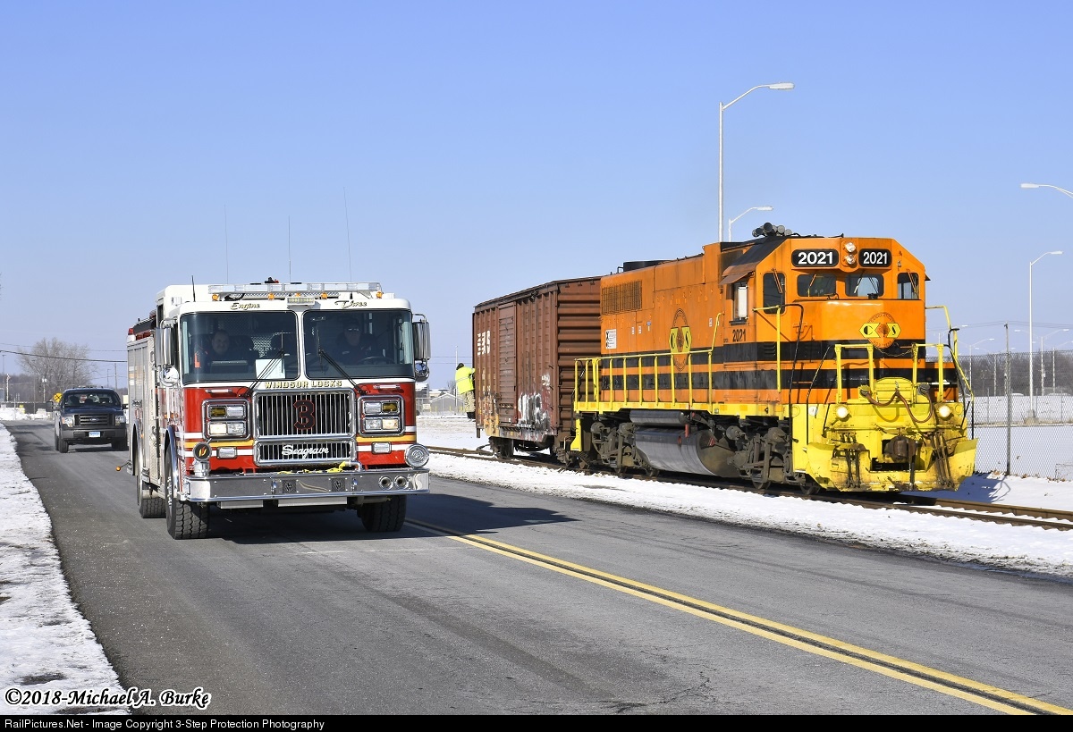 Windsor Locks Fire Dept. Engine 3 rolls by Connecticut Southern CSO-3, as it shoves back towards Ahlstrom to drop a single boxcar.