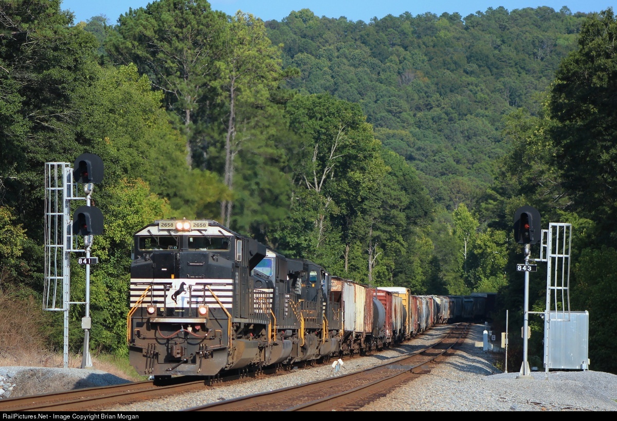 | NS SD70M-2 #2658 leads northbound Norfolk Southern manifest train #322 through the intermediate signals in Lindale, Georgia, on NS's Atlanta North District. This somewhat mountainous scene is approximately two miles from where I live. |