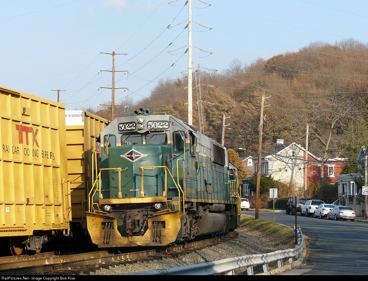 | A 1984-built ex-Missouri Pacific SD50 trundles along Railroad Street in the PA Coal Region town of Cressona. The yard is ex-Reading, and the 5022's paint scheme helps in recalling that storied old anthracite carrier. |