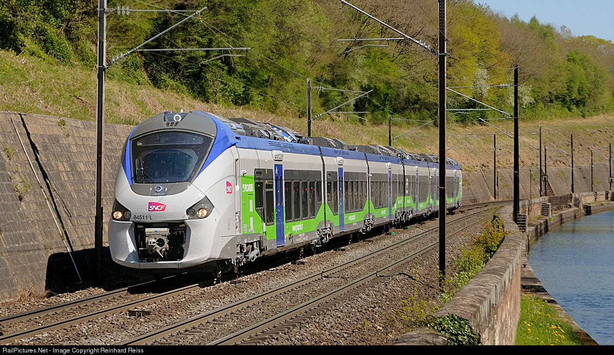 | Régiolis B 84511 bound for TER Picardie runs along the "Canal de la Marne au Rhin" between Arzviller and Sarrebourg. |